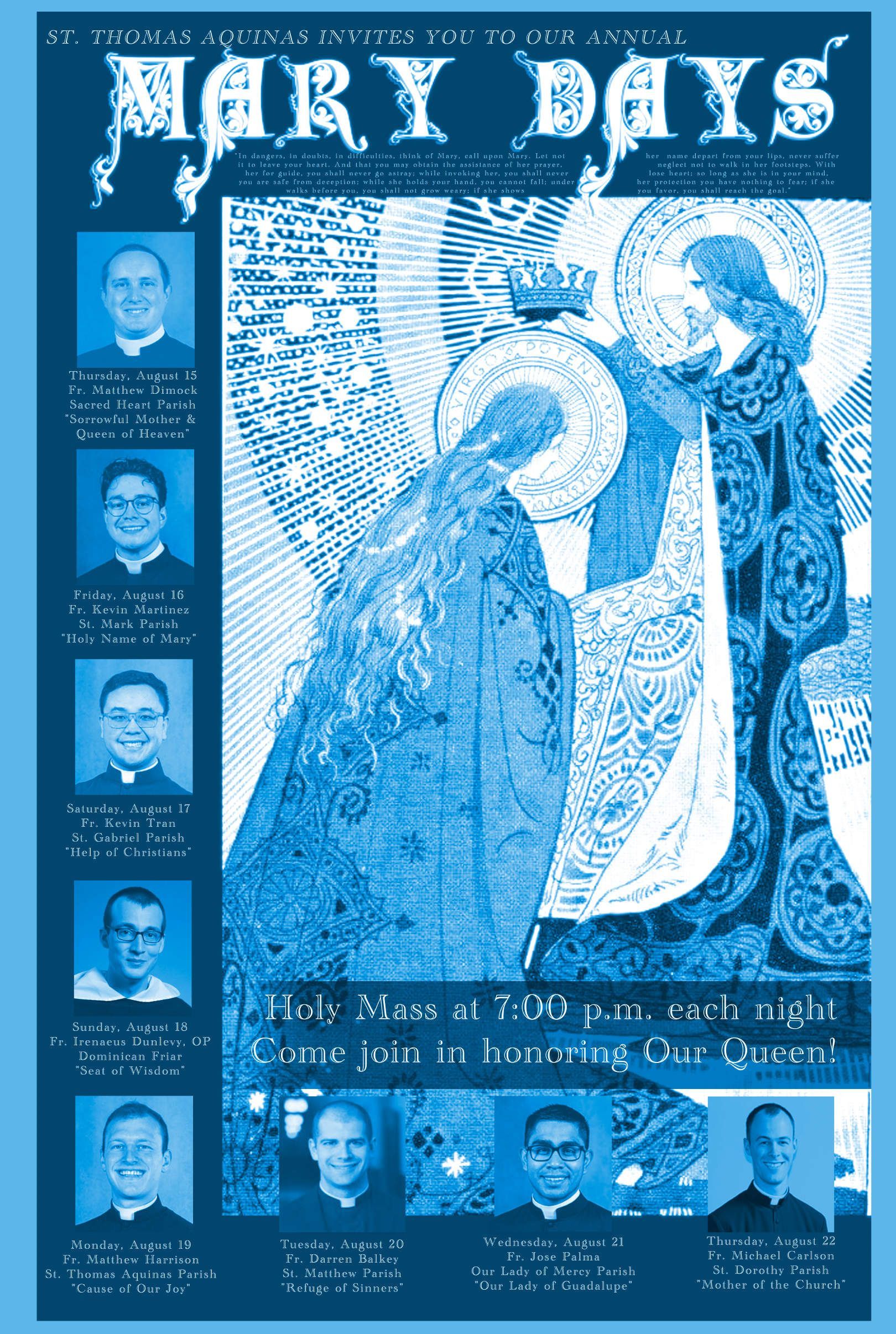 4th Annual Mary Days: Thursday, August 15 - Thursday, August 22, 2024, we have eight priests from around the Diocese and beyond here each night to celebrate Holy Mass and preach on Our Lady! Holy Mass begins each evening at 7 p.m. All are invited to this wonderful annual series of Masses celebrating Our Lady!