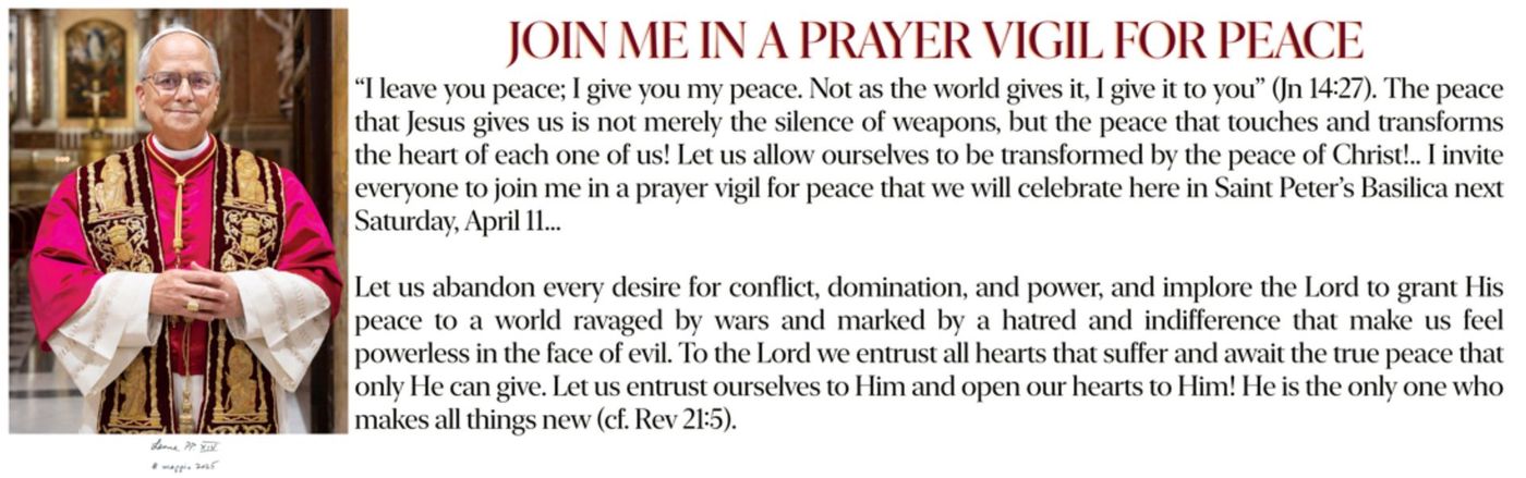 We invite all parishioners to unite their intentions with the Holy Father during the Prayer Vigil for Peace in Rome on Saturday, April 11 at 6:00 p.m. (12:00 Noon our time). If you are unable to stop by the church or the Perpetual Adoration Chapel, take a moment or two wherever you are, at home, or at work, or out to lunch, and ask the Lord, and Our Lady, to pour out the peace that only the Lord can truly give. Unite your intentions, your communions, your Rosary, a Chaplet of Divine Mercy, or whatever other heartfelt prayer you make this day to the intentions of the Holy Father, and the countless other souls throughout the world praying for peace!